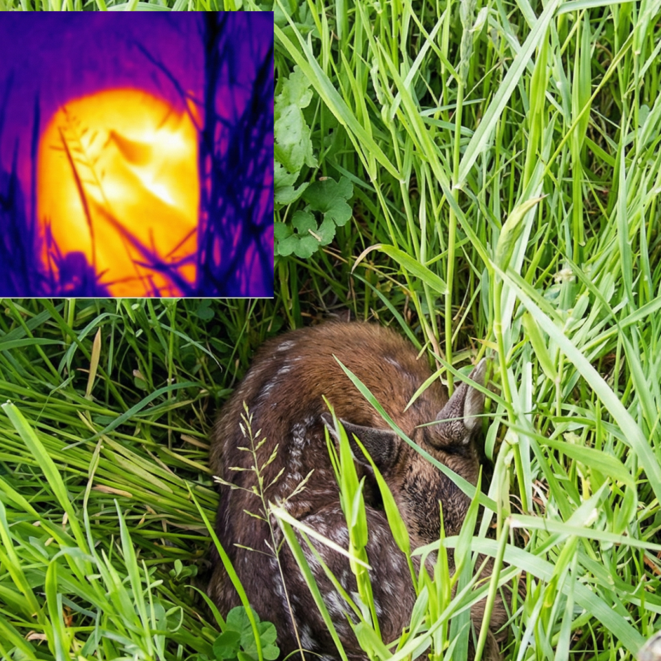 Jedes Jahr sterben zehntausende Rehkitze durch Mähmaschinen. Mit der Wärmebilddrohne spüren wir die Kitze vor der Mahd auf. Diesen Service bieten wir ehrenamtlich an.